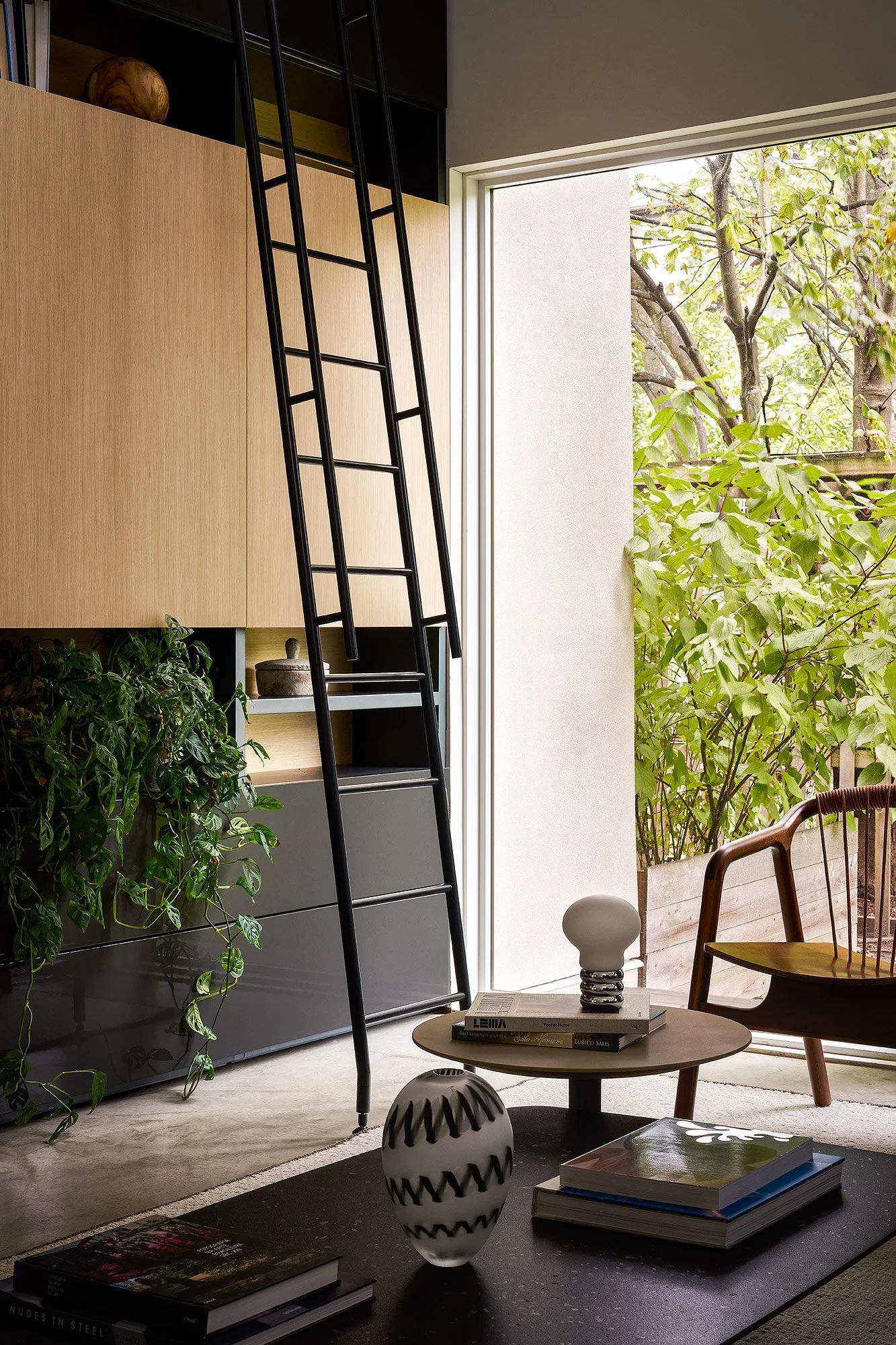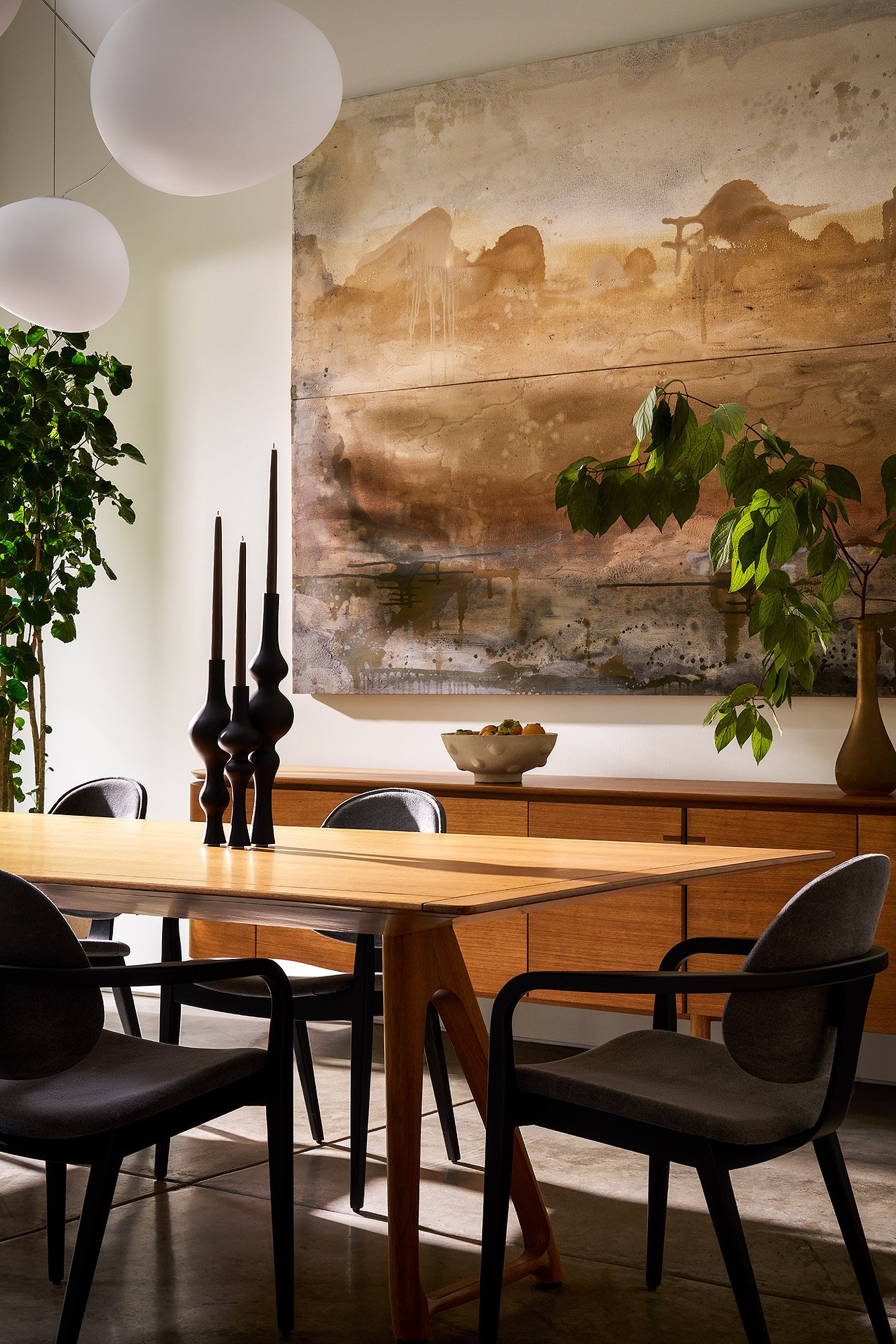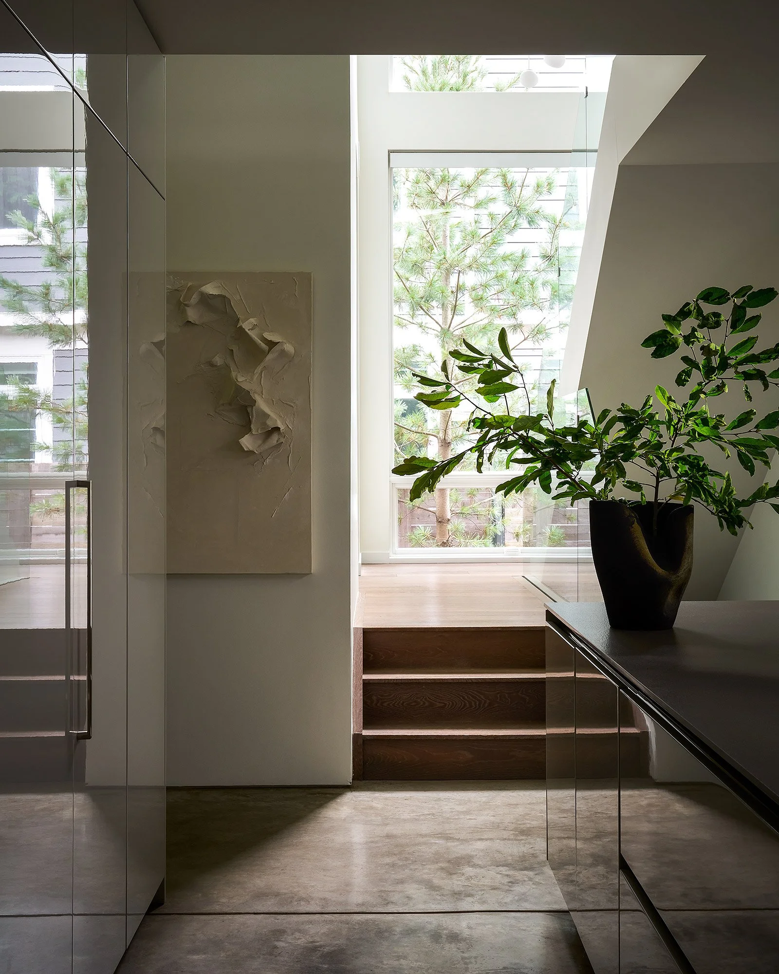Our goal was to reimagine the space without compromising its strong architectural foundation. We focused on softening the home’s minimalist shell through a considered layering of natural textures and tactile materials. A palette of warm woods, linen, and wool was introduced to create a sense of comfort and visual continuity. Custom millwork throughout the home not only unified the spaces but also carved out purposeful moments for gathering, pausing, and functional storage.